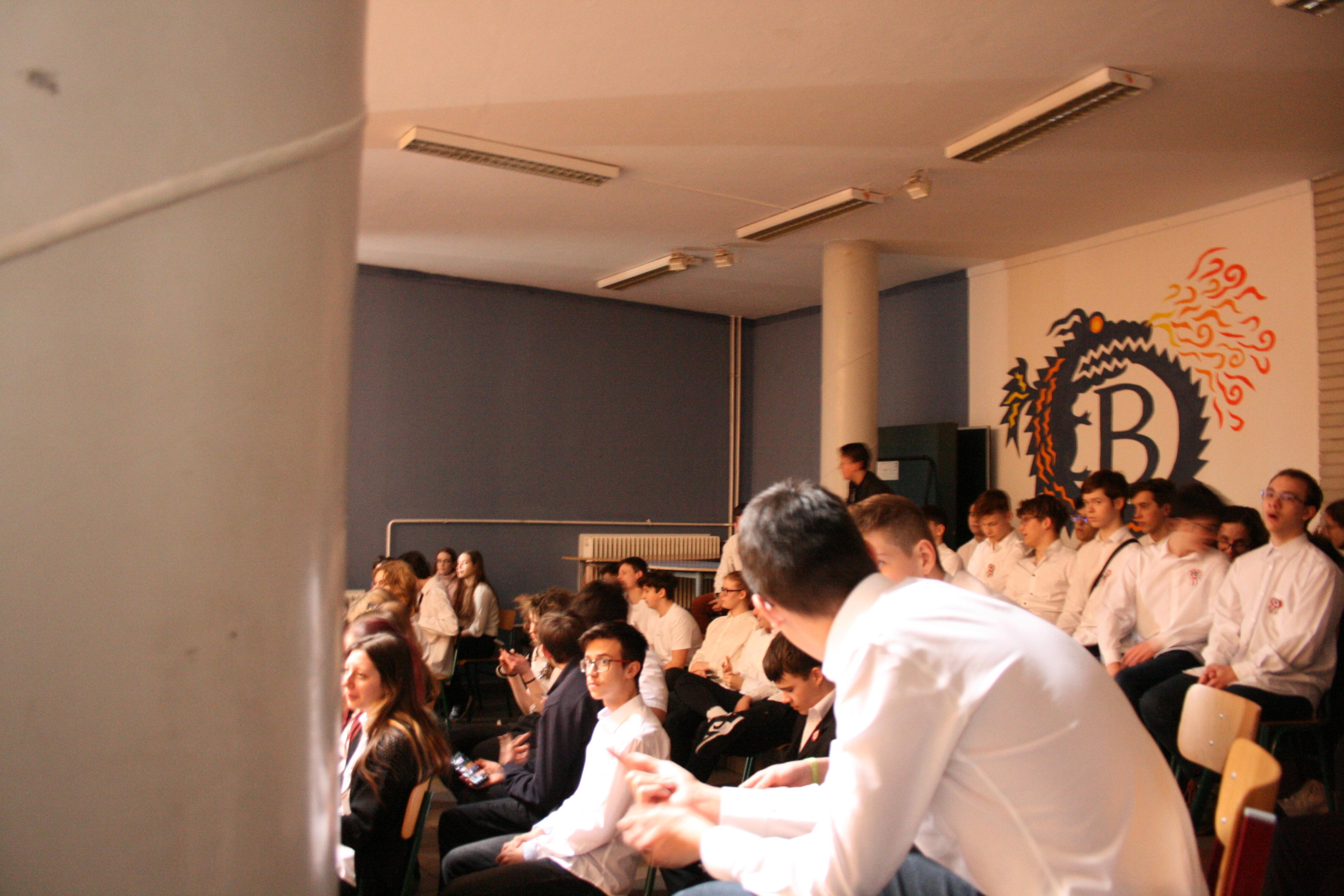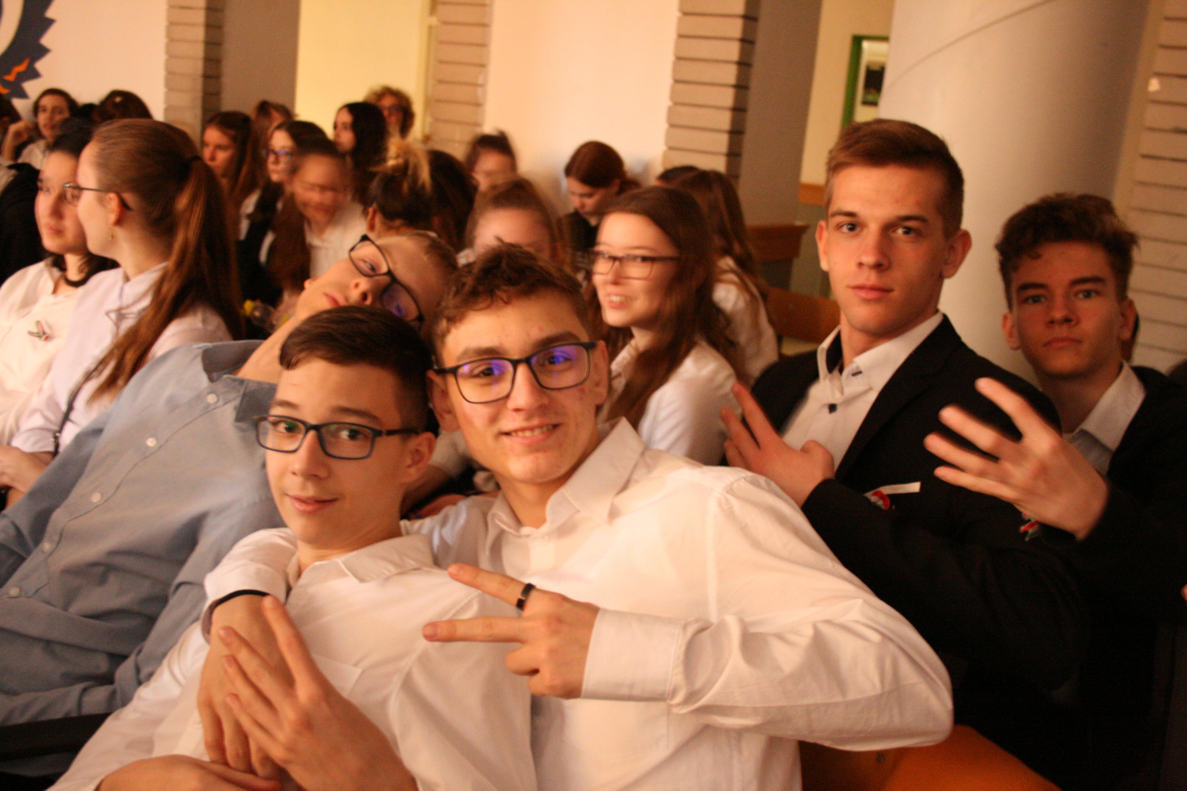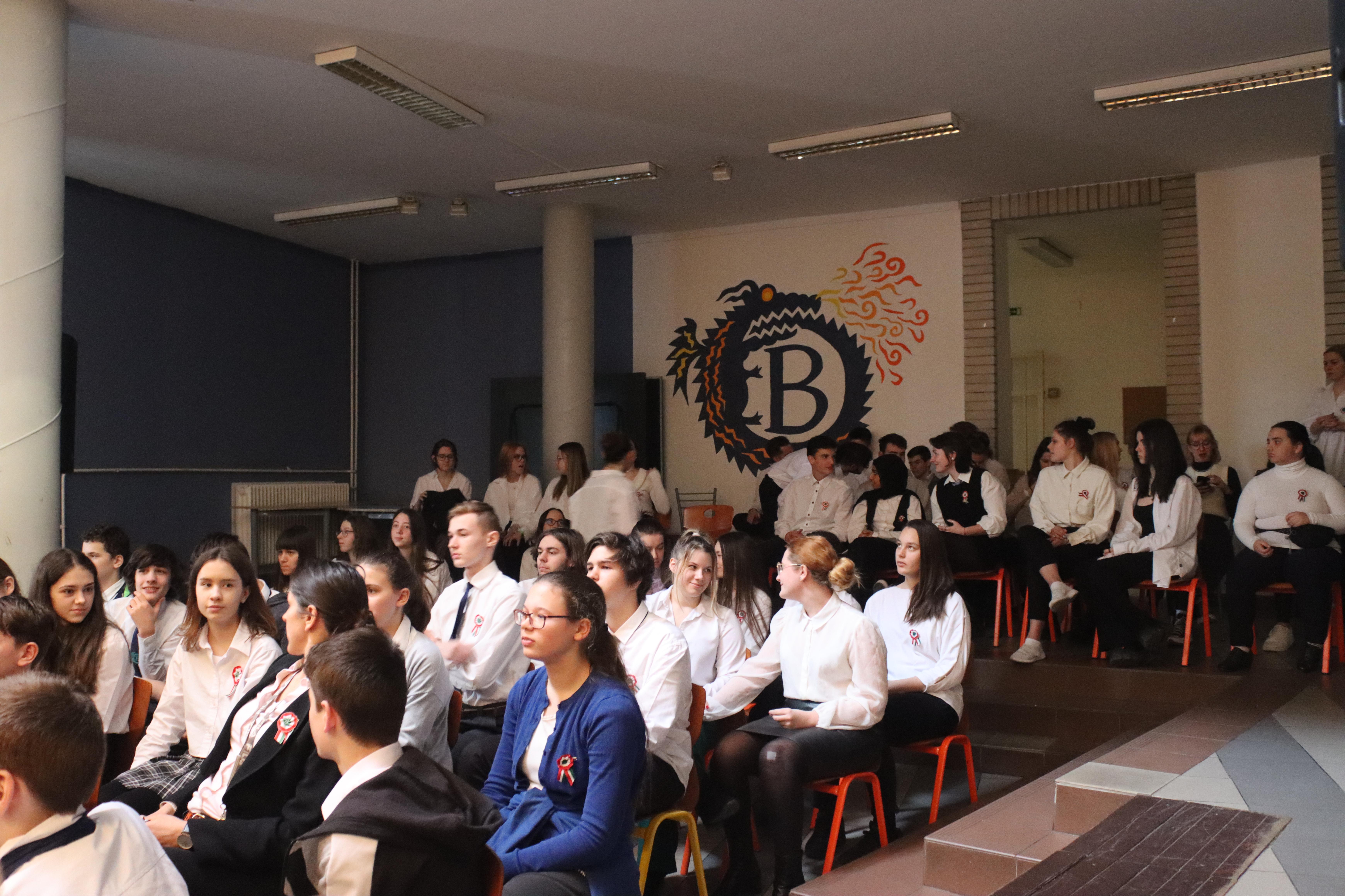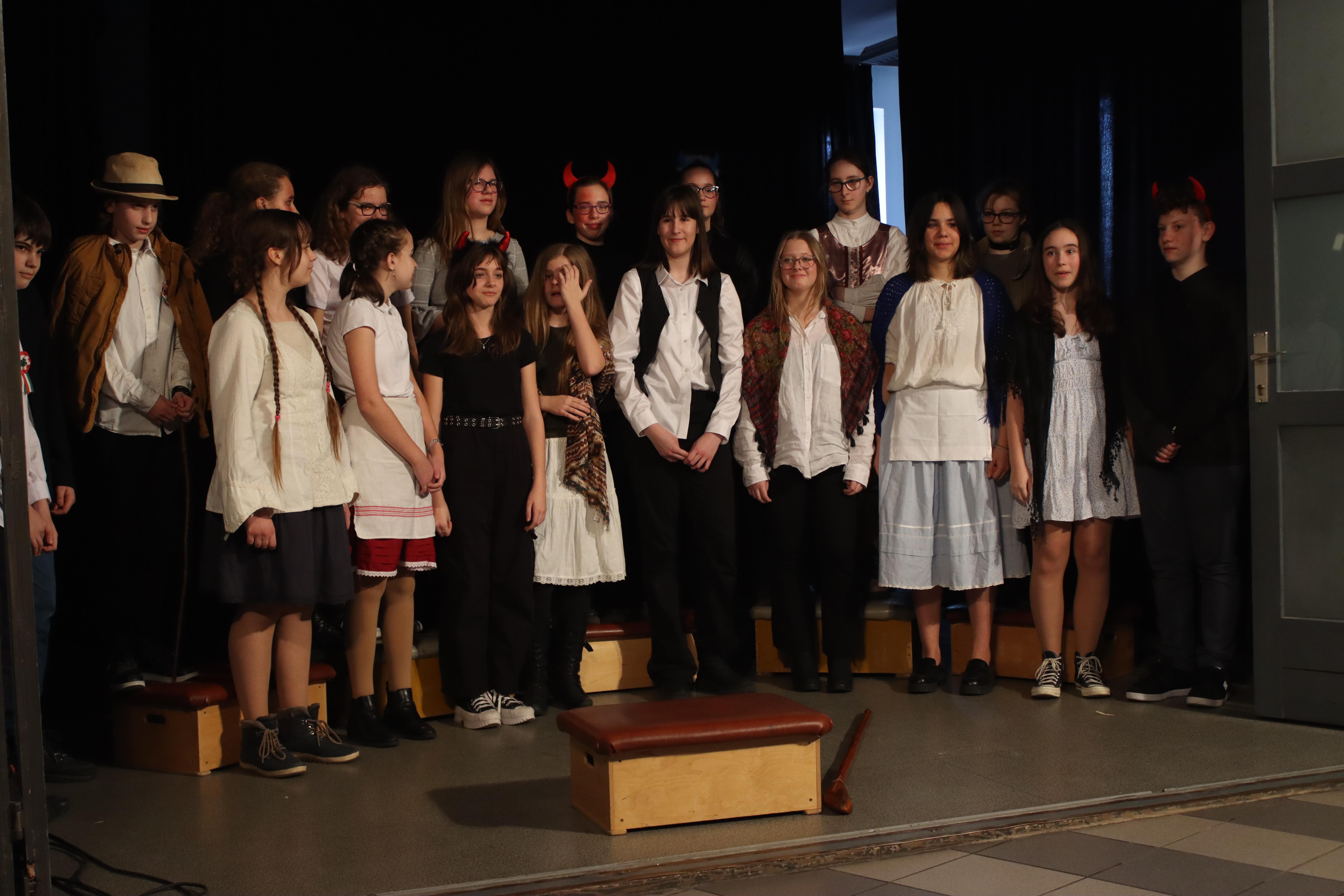 Gyülekező az előadás előtt. Fotó: Kecskeméti József / Diglió Himnuszéneklés. Fotó: Molnár Boldizsár István Józsi bácsi felkonferálja a színdarabot. Fotó: Molnár Boldizsár István Felkonf egy másik órában, egy másik fotón. Fotó: Kecskeméti József / Diglió Kezdődik a hetedikes színjátszósok előadása. Fotó: Kecskeméti József / Diglió Fotó: Kecskeméti József / Diglió Fotó: Kecskeméti József / Diglió Fotó: Kecskeméti József / Diglió Fotó: Kecskeméti József / Diglió Fotó: Kecskeméti József / Diglió Fotó: Kecskeméti József / Diglió Fotó: Molnár Boldizsár István Fotó: Kecskeméti József / Diglió Fotó: Molnár Boldizsár István Fotó: Kecskeméti József / Diglió Fotó: Kecskeméti József / Diglió Fotó: Kecskeméti József / Diglió Fotó: Kecskeméti József / Diglió Fotó: Kecskeméti József / Diglió Fotó: Kecskeméti József / Diglió Fotó: Kecskeméti József / Diglió Fotó: Kecskeméti József / Diglió Fotó: Kecskeméti József / Diglió Fotó: Kecskeméti József / Diglió Fotó: Kecskeméti József / Diglió Fotó: Kecskeméti József / Diglió Fotó: Kecskeméti József / Diglió Fotó: Kecskeméti József / Diglió Fotó: Kecskeméti József / Diglió Fotó: Kecskeméti József / Diglió Fotó: Kecskeméti József / Diglió Fotó: Kecskeméti József / Diglió Fotó: Kecskeméti József / Diglió Fotó: Kecskeméti József / Diglió Fotó: Kecskeméti József / Diglió Fotó: Kecskeméti József / Diglió Az összes színjátszós az előadás végén. Fotó: Kecskeméti József / Diglió Fotó: Kecskeméti József / Diglió Fotó: Molnár Boldizsár István Vidám nézők. Fotó: Molnár Boldizsár István Fotó: Molnár Boldizsár István Fotó: Molnár Boldizsár István Így néz ki a színpad előadók nélkül. Fotó: Molnár Boldizsár István Fotó: Molnár Boldizsár István A nézőközönség egy másik órában. Fotó: Kecskeméti József / Diglió A szózat után visszavonultak a népek az osztálytermekbe. Fotó: Kecskeméti József / Diglió